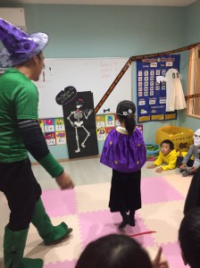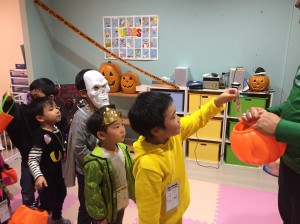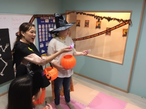 教室の中ではMellissa先生・Nickie先生も仮装をしてお出迎え(^^♪そして、お菓子をもらいます。