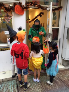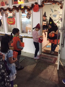 教室の外に出てドアを叩いて、大きな声で〝Trick or treat〟といつもは違う英語を使って教室に入ります。