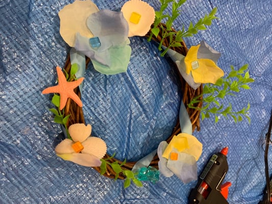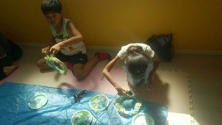 夏!ということで貝殻や、透明感のあるタイル、花びらや葉の造花を用意してみんな思い思いに飾り付けをしていきます。